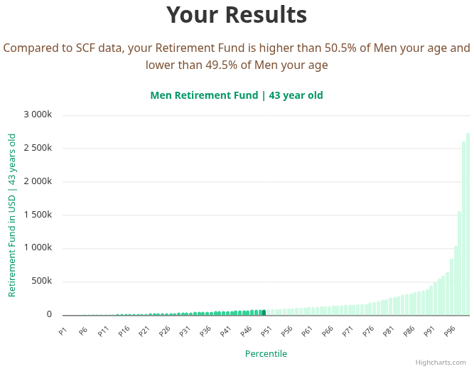 For most 43 year old men in America, retirement fund measurements fall between $28,331 and $161,891 USD. The median retirement fund for men in this age group is $80,945 USD, according to the Federal Reserve's 2022 Survey of Consumer Finances and anonymized data from users.
