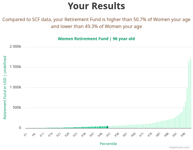 For most 96 year old women in America, retirement fund measurements fall between $20,942 and $119,668 USD. The median retirement fund for women in this age group is $59,834 USD, according to the Federal Reserve's 2022 Survey of Consumer Finances and anonymized data from users.